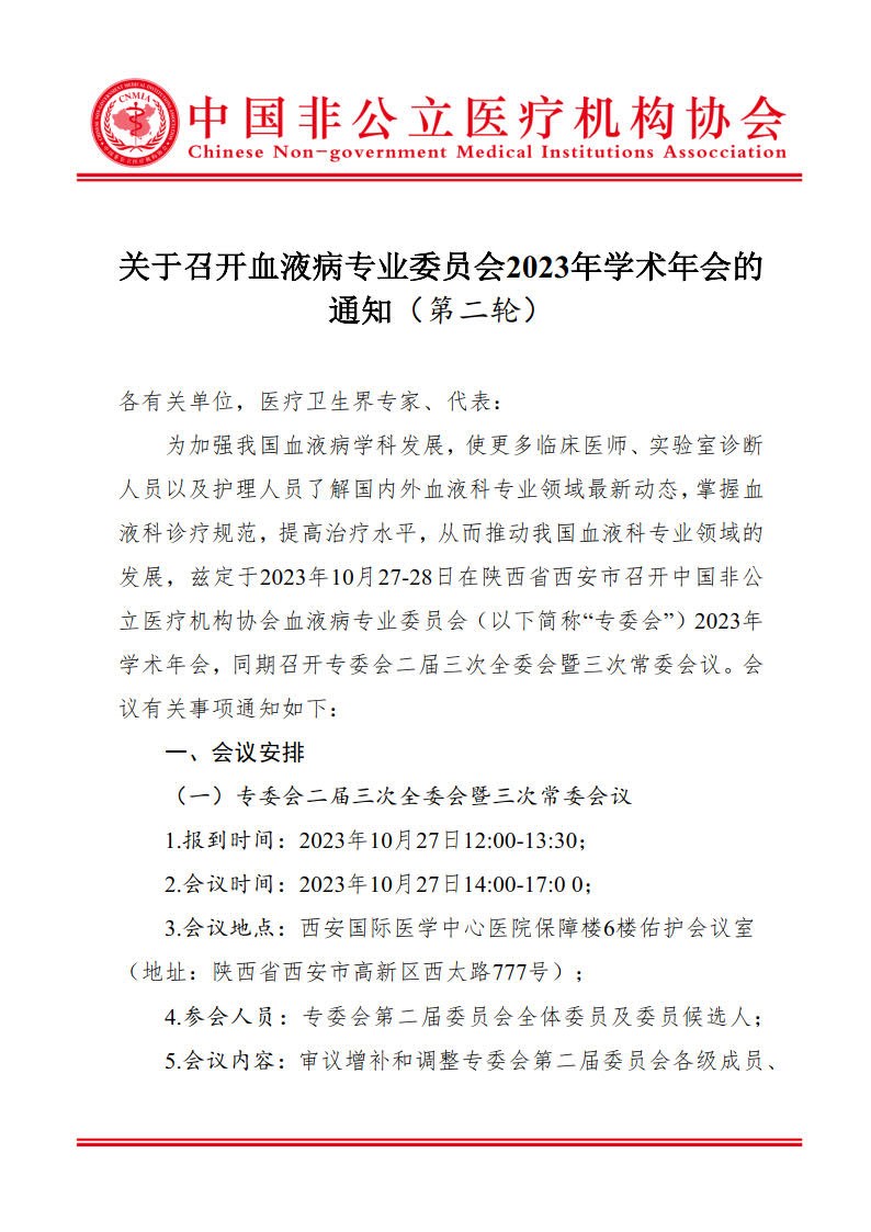 為加強我國血液病學(xué)科發(fā)展,使更多臨床醫(yī)師、實驗室診斷人員以及護理人員了解國內(nèi)外血液科專業(yè)領(lǐng)域最新動態(tài),掌握血液科診療規(guī)范,提高治療水平,從而推動我國血液科專業(yè)領(lǐng)域的發(fā)展,茲定于2023年10月27-28日在陜西省西安市召開中國非公立醫(yī)療機構(gòu)協(xié)會血液病專業(yè)委員會(以下簡稱“專委會”)2023年學(xué)術(shù)年會,同期召開專委會二屆三次全委會暨三次常委會議。會議有關(guān)事項通知如下: