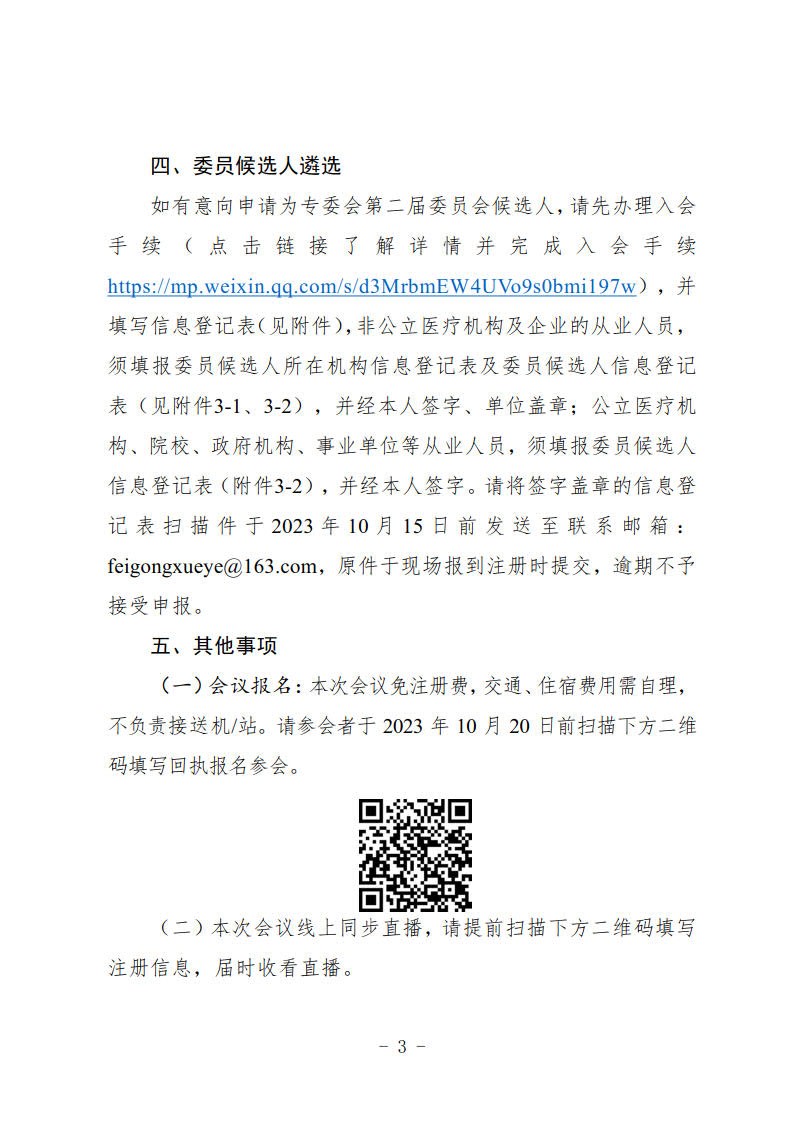 如有意向申請為專委會第二屆委員會候選人,請先辦理入會手續(xù)(點擊鏈接了解詳情并完成入會手續(xù)https://mp.weixin.qq.com/s/d3MrbmEW4UVo9s0bmi197w),并填寫信息登記表(見附件),非公立醫(yī)療機構(gòu)及企業(yè)的從業(yè)人員,須填報委員候選人所在機構(gòu)信息登記表及委員候選人信息登記表(見附件3-1、3-2),并經(jīng)本人簽字、單位蓋章;公立醫(yī)療機構(gòu)、院校、政府機構(gòu)、事業(yè)單位等從業(yè)人員,須填報委員候選人信息登記表(附件3-2),并經(jīng)本人簽字。請將簽字蓋章的信息登記表掃描件于2023年10月15日前發(fā)送至聯(lián)系郵箱:feigongxueye@163.com,原件于現(xiàn)場報到注冊時提交,逾期不予接受申報。