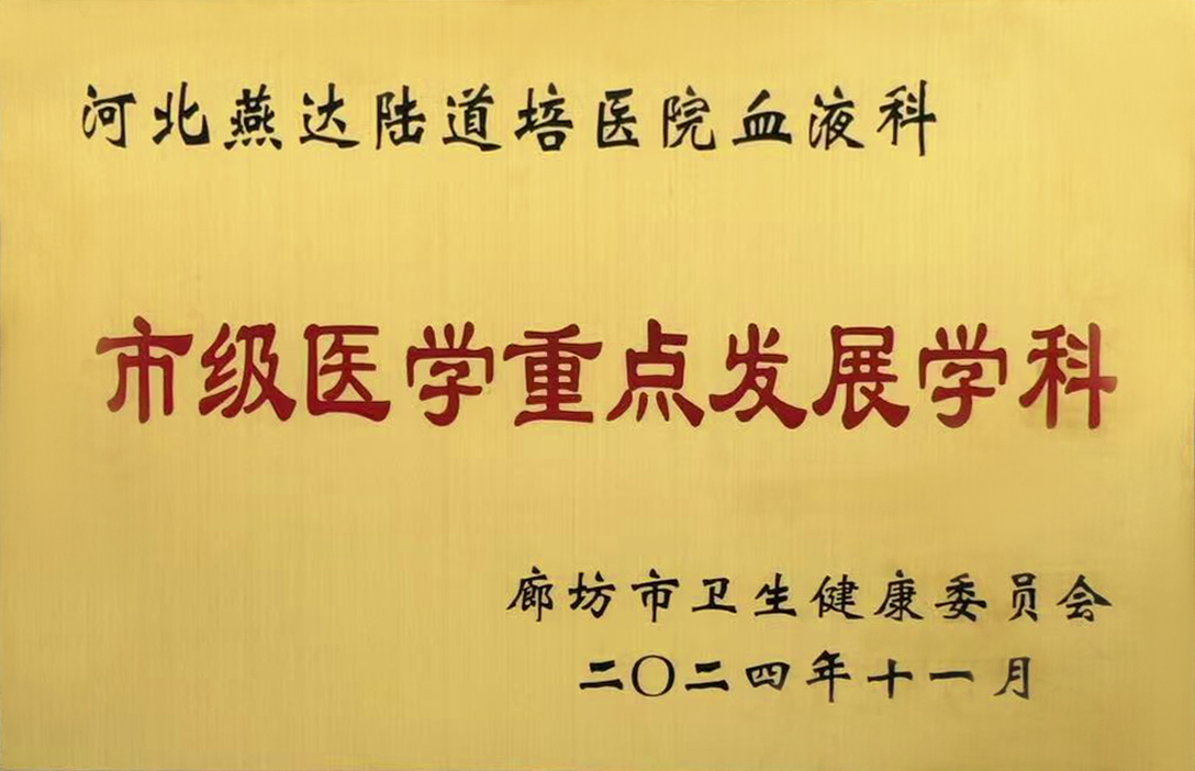 河北燕達(dá)陸道培醫(yī)院血液科是市級(jí)醫(yī)學(xué)重點(diǎn)發(fā)展學(xué)科。