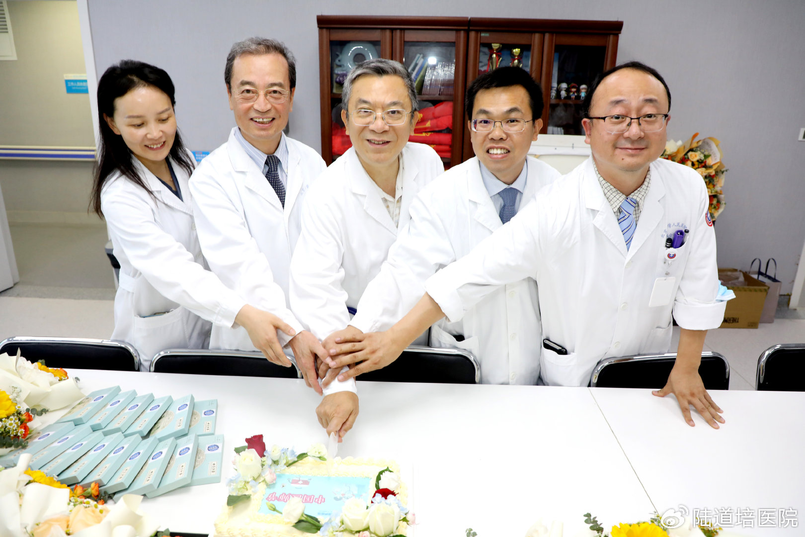 8月16日,中國(guó)工程院院士、北京大學(xué)血液病研究所所長(zhǎng)黃曉軍院士、北京陸道培血液病醫(yī)院醫(yī)療常務(wù)副院長(zhǎng)王景文教授、聯(lián)合病房孫于謙主任等醫(yī)師團(tuán)隊(duì),在病例談?wù)?、大查房結(jié)束之后,在血液二病區(qū)會(huì)議室進(jìn)行了簡(jiǎn)單的慶祝,并以切蛋糕的方式共度節(jié)日。